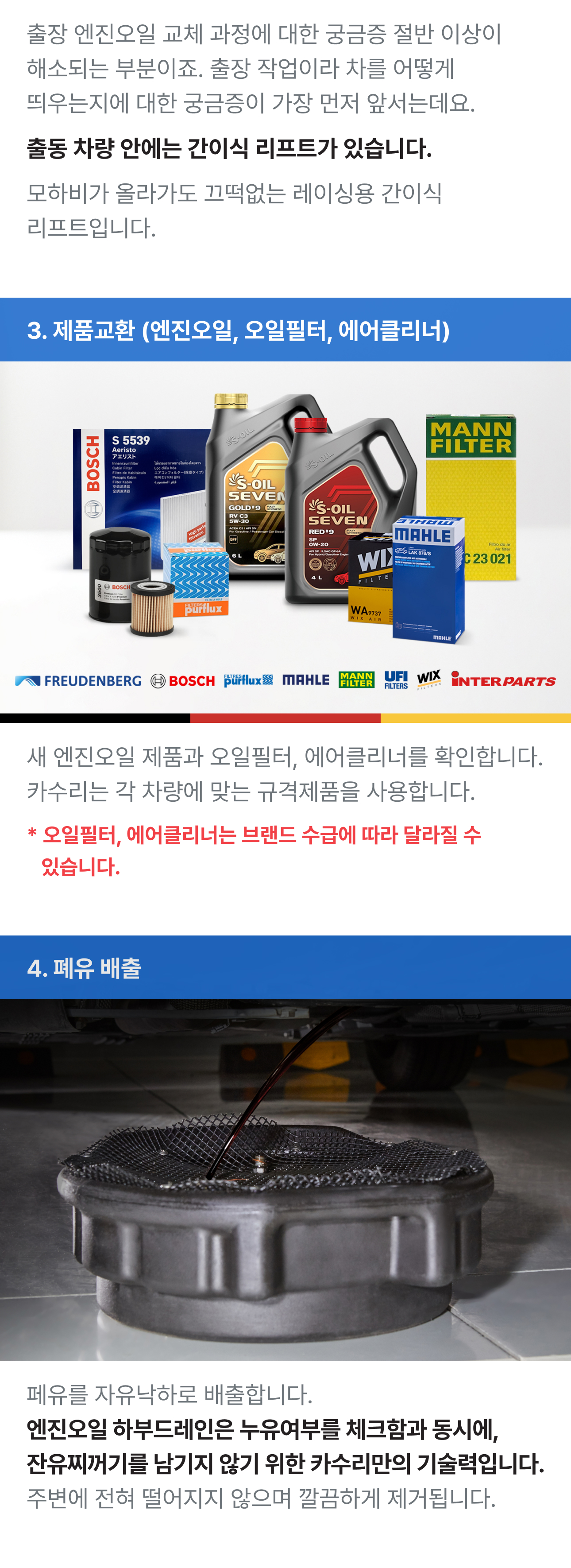 엔진오일, 필터류, 공임비, 출장비, 무상안전 점검이 모두 포함된 가격입니다. 추가 요금은 발생하지 않습니다.