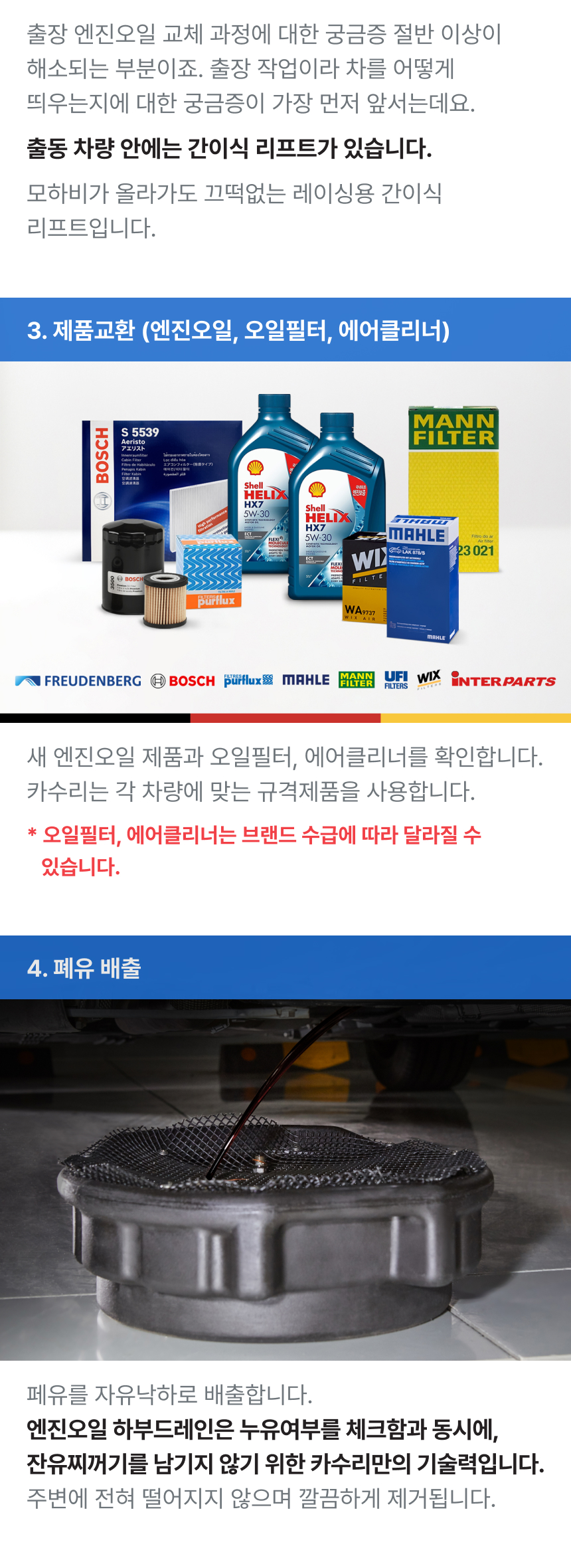 엔진오일, 필터류, 공임비, 출장비, 무상안전 점검이 모두 포함된 가격입니다. 추가 요금은 발생하지 않습니다.